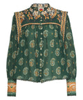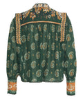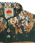 La camicia Farmrio affascina con il suo design dettagliato. Il modello presenta una sontuosa stampa floreale e un sorprendente motivo paisley, creando un'estetica vivace. L'elegante collo alto e le maniche lunghe con polsini elasticizzati sottolineano lo stile raffinato. Una chiusura a bottoni continua e il bordo finemente lavorato sull'orlo completano armoniosamente il design.