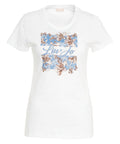 Questa T-shirt di Liu Jo White è realizzata in puro cotone, offrendo un comfort ottimale. Presenta una stampa frontale elegante che combina elementi floreali con il logo del marchio. Il classico girocollo e le maniche corte completano il design contemporaneo, rendendola un capo basico versatile per look femminili.