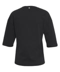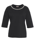 Questa t-shirt in puro cotone è un'aggiunta lussuosa per ogni guardaroba. Si distingue per un'elegante scollatura rotonda, impreziosita da brillanti applicazioni di strass. Le maniche a tre quarti offrono una vestibilità versatile e sottolineano il suo carattere elegante.