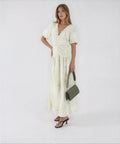 L'abito maxi 'Abelline' affascina con il suo design romantico e una silhouette femminile. Un profondo scollo a V con giocosi dettagli di ruches e maniche corte a sbuffo donano al modello un tocco elegante. La stampa floreale sottolinea il carattere estivo, mentre la vita arricciata assicura una vestibilità lusinghiera. Un capo ideale per occasioni sofisticate.
