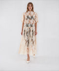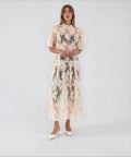 L'abito maxi 'Alexia' affascina con il suo design romantico realizzato in un pregiato misto cotone. I dettagli in pizzo filigranato e la finitura semitrasparente conferiscono a questo modello un'eleganza femminile. Un collo alla coreana con una corta abbottonatura e le maniche corte completano armoniosamente il look lussuoso. Ideale per occasioni estive che richiedono una sottile raffinatezza.