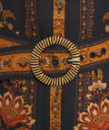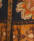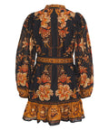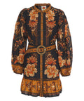 Questo abito elegante si distingue per una fantasia floreale ricca di dettagli e un'aura lussuosa. Presenta un classico collo alla coreana e una chiusura a bottoni su tutta la lunghezza che sottolinea la silhouette. Le maniche lunghe a sbuffo con polsini elastici e una cintura in vita con fibbia decorativa aggiungono un tocco raffinato al design. L'abito mini è completato da un giocoso orlo a balze.
