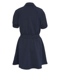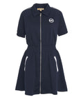 Questo elegante abito Michael Kors si distingue per il suo design sportivo e la silhouette femminile. Presenta un classico colletto, maniche corte con dettagli a strisce e una cerniera a tutta lunghezza sul davanti. L'elastico in vita accentua la figura, mentre le tasche laterali e la minigonna svasata aggiungono tocchi pratici ed eleganti. Un prominente ricamo logo sul petto completa il design.