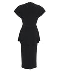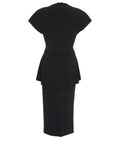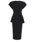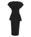 Questo elegante abito Norma Kamali incarna l'eleganza intramontabile e una silhouette lusinghiera. Presenta una classica scollatura rotonda e maniche corte. Il taglio sartoriale con un caratteristico peplum e una cintura accentua la forma femminile. Un design versatile adatto per occasioni speciali e guardaroba raffinati.