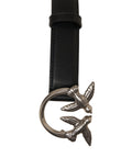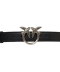 Questa cintura Pinko è realizzata in morbida pelle. Si distingue per la caratteristica fibbia in metallo con gli iconici Love Birds, un inconfondibile dettaglio logo del marchio. Questo accessorio aggiunge un tocco di stile e lusso a qualsiasi outfit.