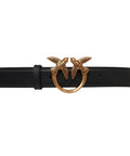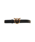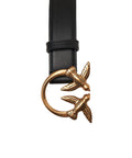 Questa cintura Pinko è realizzata in morbida pelle. Si distingue per la caratteristica fibbia in metallo con gli iconici Love Birds, un inconfondibile dettaglio logo del marchio. Questo accessorio aggiunge un tocco di stile e lusso a qualsiasi outfit.