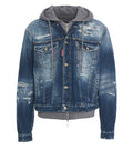 Questa esclusiva giacca in denim firmata Dsquared2 si distingue per il suo particolare design 2-in-1 con inserto con cappuccio integrato. Made in Italy in puro cotone, questo capo unisce lo stile urbano alla massima maestria artigianale. I caratteristici effetti usurati e le pratiche tasche a pattina sul petto conferiscono un tocco autentico e lussuoso.