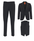 Questo elegante abito a tre pezzi 'Tevere' colpisce per il suo design senza tempo e la lavorazione di alta qualità. La giacca è dotata di un raffinato scialle e di una classica chiusura a un bottone, mentre il gilet e i pantaloni coordinati completano perfettamente l'insieme. Made in Italy, questo set garantisce un look sofisticato per le occasioni formali. I pantaloni con precise pieghe stirate assicurano inoltre una silhouette sottile e moderna.