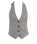 Questo elegante gilet di Liu Jo si distingue per il suo raffinato design con scollatura neckholder. Il modello presenta un profondo scollo a V, una classica chiusura con bottoni e un particolare dettaglio a cravatta sul retro. Due discrete tasche a filetto sul davanti e la finitura melange completano il look lussuoso di questo capo monopetto.