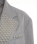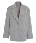Questo elegante blazer si presenta come un lussuoso capo d'impatto. Caratterizzato da un design classico con chiusura a un bottone e revers a specchio. I dettagli borchiati sul revers conferiscono a questa giacca monopetto un tocco distintivo e moderno. Le tasche con patta e le spalline completano il design, garantendo una silhouette definita.