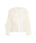 Questa camicetta femminile di Second Female presenta eleganti dettagli a balze sul davanti e sulle maniche. Il taglio ampio e lo scollo rotondo creano un look moderno e arioso. Un top versatile che può essere abbinato in modo casual o elegante, aggiungendo un tocco romantico a qualsiasi outfit.
