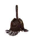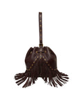 Questa lussuosa borsa a secchiello di La Carrie si distingue per la sua pelle martellata e le ampie frange nella parte inferiore. Occhielli in metallo color oro e un accattivante ciondolo con logo aggiungono un tocco raffinato al design. Presenta una pratica chiusura con coulisse e un elegante manico. Un accessorio di stile per occasioni speciali.