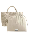 Questa elegante borsa a mano si distingue per il moderno design intrecciato. Realizzata in neoprene, offre ampio spazio per tutti i tuoi oggetti essenziali. Il modello è caratterizzato da una forma pratica e da manici robusti, perfetti per un utilizzo quotidiano. Un accessorio versatile e raffinato, ideale per completare qualsiasi look.