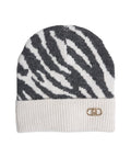 Questo morbido berretto in maglia presenta una stampa animalier sorprendente e un risvolto a costine. Un discreto dettaglio logo color oro adorna il bordo, aggiungendo un tocco lussuoso all'accessorio. È il complemento ideale per look invernali eleganti, offrendo allo stesso tempo un comfort piacevole.