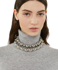 Questo elegante collier di Max Mara colpisce per la sua disposizione a doppio strato di perle lucide. Tra gli elementi elegantemente disposti, gli strass scintillanti sono accentuati, conferendo una lucentezza lussuosa. Una discreta etichetta con logo sulla chiusura sottolinea l'esclusività dell'accessorio. Ideale per aggiungere un tocco glamour a qualsiasi outfit.