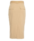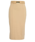 Questa elegante gonna midi di Elisabetta Franchi colpisce per la sua silhouette aderente e la cintura integrata con dettaglio logo color oro. Il suo taglio slanciato e la lunghezza midi le conferiscono un fascino classico, ideale per look versatili. Il design enfatizza il punto vita e offre un'estetica sofisticata. Made in Italy.