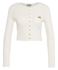 Questo cardigan corto in maglia di Elisabetta Franchi presenta un elegante design a costine con scollo rotondo. Bottoni color oro adornano l'abbottonatura frontale e le tasche applicate sul petto. Un distintivo dettaglio logo sulla tasca sinistra sottolinea il carattere lussuoso del design. Un capo versatile per outfit di stile, perfettamente abbinabile.