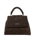 Questa lussuosa borsa a mano di Orciani è realizzata in pregiata pelle scamosciata e colpisce per il suo design elegante. Il manico intrecciato distintivo le conferisce un tocco unico. Con la sua pratica chiusura a patta e il discreto dettaglio del logo, è un accessorio di stile. Made in Italy.