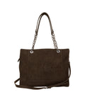 Questa elegante shopper di La Carrie è un accessorio versatile per tutti i giorni. Realizzata in ecopelle di alta qualità con effetto scamosciato, il modello presenta sorprendenti applicazioni di borchie lungo i bordi. Dispone di due comodi manici e un'elegante tracolla a catena, completata da un ciondolo a nappa decorativo.