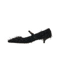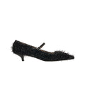 Queste eleganti décolleté Maximilian presentano una tomaia sorprendente, impreziosita da fini dettagli sfrangiati in lurex che creano una texture unica e lussuosa. Il design è caratterizzato da una punta affusolata e da una distintiva chiusura a cinturino sul collo del piede, che assicura una calzata femminile. Un sottile tacco basso completa l'aspetto elegante. Made in Italy, queste décolleté incarnano una squisita maestria artigianale.