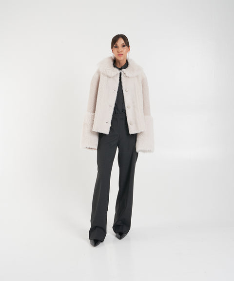 Diese luxuriöse Jacke von 1972 Desa ist aus hochwertigem Lammfell gefertigt und besticht durch ihr elegantes Design. Sie präsentiert sich mit einem opulenten Pelzkragen und markanten Ärmeln mit breiten Fellbündchen. Eine glatte Knopfleiste vorne verleiht dem Modell eine raffinierte Note. Ideal für einen stilvollen Auftritt in der kälteren Jahreszeit.