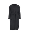 Dieser elegante Mantel von Skall überzeugt durch sein zeitloses Design und die klare Linienführung. Er präsentiert sich kragenlos und mit einem schmeichelhaften Taillengürtel, der die Silhouette betont. Ideal für vielseitige Looks, bietet dieser Mantel eine luxuriöse Ergänzung für jede Garderobe.