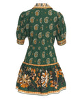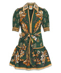 Dieses elegante Kleid von Farmrio präsentiert sich mit einem ansprechenden floralen Druck. Das Design zeichnet sich durch einen schmeichelhaften V-Ausschnitt, einen Hemdkragen und kurze Puffärmel aus. Schleifendetails in der Taille betonen die Silhouette, während der ausgestellte Rock mit Rüschendetails für eine verspielte Note sorgt. Ein charmantes Stück für stilvolle Anlässe.