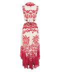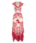 Dieses luxuriöse Maxikleid von Farmrio besticht durch sein exquisites Design. Es präsentiert sich mit einem charmanten V-Ausschnitt, der von eleganten Rüschendetails geziert wird, sowie stilvollen Flügelärmeln. Die Taillenpartie ist mit modischen Cut-Outs und einem dekorativen Schleifendetail versehen, das in einem praktischen Zugverschluss mündet. Ein femininer floraler Druck ziert das gesamte Kleid und wird durch einen verspielten asymmetrischen Saum abgerundet.