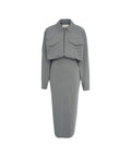 Dieses moderne Maxikleid von Staud präsentiert sich mit einem schicken zweiteiligen Design. Es verfügt über ein kurz geschnittenes Oberteil mit Hemdkragen, Reißverschluss und praktischen Pattentaschen. Der passende, taillierte Rock fällt in einer eleganten Maxilänge und schafft eine stilvolle Silhouette für vielseitige Anlässe.