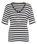 Dieses T-Shirt von LIU JO SPORT vereint sportlichen Chic mit luxuriösen Details. Es zeichnet sich durch ein klassisches Streifenmuster und einen eleganten V-Ausschnitt aus. Die Ärmel sind kurz und mit einem charmanten Knopfdetail versehen. Eine funkelnde Logoapplikation auf der Vorderseite setzt einen glamourösen Akzent.