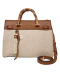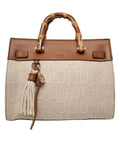 Diese stilvolle Handtasche von Liu Jo besticht durch ihr elegantes Design. Das Modell verfügt über einzigartigen Bambushenkel und eine charmante Quaste, die dem Accessoire eine besondere Note verleihen. Ein geprägtes Markenlogo ziert das Hauptmaterial und unterstreicht die Exklusivität. Der praktische Innenraum bietet ausreichend Platz für Ihre Essentials.
