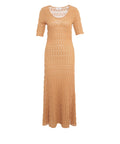 Das elegante Maxikleid 'Scarlett' besticht durch sein filigranes Strickmuster und eine feminine Silhouette. Die semitransparente Optik verleiht dem Design eine sommerliche Leichtigkeit, während der klassische Rundhalsausschnitt zeitlose Eleganz ausstrahlt. Kurze Ärmel und die fließende Länge machen dieses Modell zu einem vielseitigen Begleiter für gehobene Anlässe.