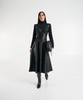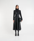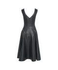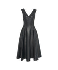 Dieses elegante A-Linienkleid von Norma Kamali besticht durch sein hochwertiges Kunstleder. Es präsentiert sich mit einem klassischen V-Ausschnitt und einer taillierten Silhouette, die in einen ausgestellten Midirock übergeht. Feine vertikale Nähte sorgen für eine exzellente Passform und eine anspruchsvolle Struktur. Ein zeitloses Design für einen luxuriösen Auftritt.
