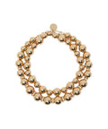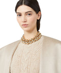 Dieses elegante Collier von Max Mara besticht durch seine doppellagige Anordnung glänzender Kugeln. Zwischen den stilvoll arrangierten Elementen sind funkelnde Strasssteine akzentuiert, die einen luxuriösen Glanz verleihen. Ein dezentes Logoetikett am Verschluss unterstreicht die Exklusivität des Accessoires. Ideal, um jedem Outfit eine glamouröse Note zu verleihen.
