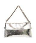 Diese exklusive Schultertasche wurde aus hochwertigem Leder mit einem faszinierenden Metallic-Glanz und einer markanten Knitteroptik gefertigt. Sie zeichnet sich durch eine stilvolle Klappe und ein dezentes Logodetail aus. Der auffällige Kettenschulterriemen unterstreicht das moderne und luxuriöse Design der Tasche. Ein stilvolles und vielseitiges Accessoire für den anspruchsvollen Auftritt, fachmännisch hergestellt in Italien.
