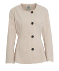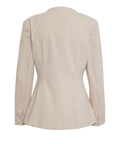 Dieser elegante Blazer besticht durch seine feminine Silhouette und den modernen, kragenlosen Schnitt. Das Modell 'Amaze' zeichnet sich durch eine markante Knopfleiste auf der Vorderseite sowie präzise Nahtdetails aus, die die Passform formvollendet unterstreichen. Lange Ärmel und ein klassischer Rundhalsausschnitt machen dieses Stück zu einem vielseitigen Begleiter für die anspruchsvolle Garderobe.