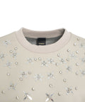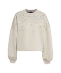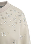 Dieses exquisite Sweatshirt besticht durch seine glamourösen Strassapplikationen und Perlen, die ein florales Muster auf der Vorderseite und den Schultern bilden. Es ist mit einem klassischen Rundhalsausschnitt sowie langen, voluminösen Ärmeln mit gerippten Bündchen ausgestattet. Der moderne, legere Schnitt und der gerippte Saum runden das Design stilvoll ab.