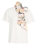 Dieses luxuriöse T-Shirt von Liu Jo White aus reiner Baumwolle besticht durch einen schmeichelhaften V-Ausschnitt und kurze Ärmel. Ein integrierter Schal mit einem edlen Blumenmuster verleiht dem Kleidungsstück eine raffinierte Schalkragen-Optik. Das weiche Gewebe sorgt für außergewöhnlichen Tragekomfort und ein angenehmes Hautgefühl. Made in Italy, verkörpert es mühelose Eleganz und ein originelles Design.