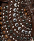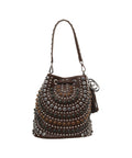 Die Beuteltasche 'Andromeda' von La Carrie präsentiert sich mit einem markanten Design. Sie ist vollständig mit einer Vielzahl glänzender Nieten und facettierter Steine besetzt, die für einen außergewöhnlichen Look sorgen. Gefertigt aus getrommeltem Kunstleder, verfügt sie über einen praktischen Zugverschluss und einen eleganten Tragegriff. Ein stilvolles Statement-Accessoire für jede Gelegenheit.