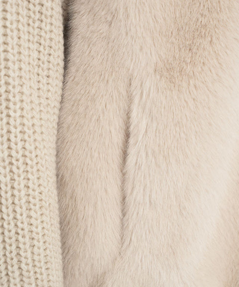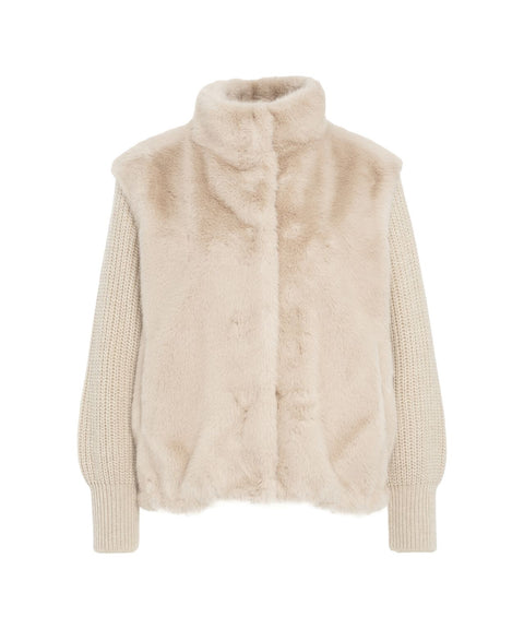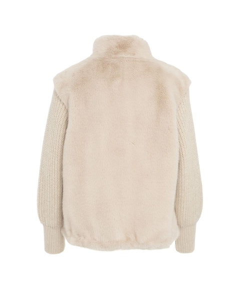 Diese luxuriöse Herno Jacke präsentiert sich als stilvoller Materialmix aus weichem Kunstpelz und gerippten Strickärmeln. Sie verfügt über einen eleganten Stehkragen und einen verdeckten Knopfverschluss, der für eine nahtlose Optik sorgt. Ihre bequeme Passform macht sie zum idealen Begleiter für kühlere Tage.