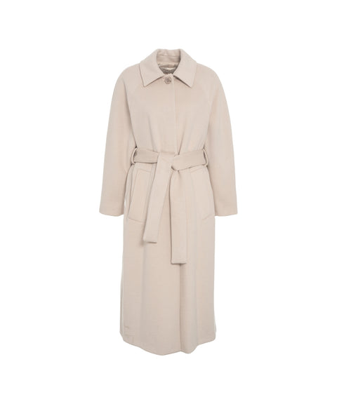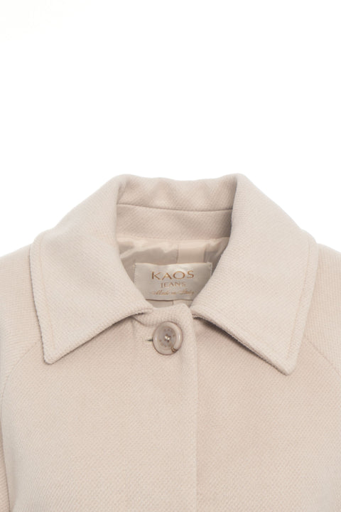 Dieser Kaos Mantel präsentiert sich in einer zeitlosen, eleganten Silhouette. Er ist mit einem klassischen Kragen, komfortablen Raglanärmeln und einer durchgehenden, verdeckten Knopfleiste ausgestattet. Der farblich passende Bindegürtel betont die Taille stilvoll, ergänzt durch zwei geräumige aufgesetzte Taschen. Hergestellt in Italien, ist dieses vielseitige Modell ein luxuriöser Begleiter für die Übergangszeit und kühlere Tage.