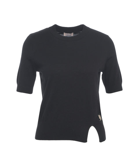 Dieses moderne T-Shirt von Liu Jo White präsentiert sich mit einem klassischen Rundhalsausschnitt und kurzen Ärmeln. Ein charakteristisches Merkmal ist der asymmetrische Saum mit einem seitlichen Schlitz, der dem Design eine besondere Note verleiht. Das stilvolle Logodetail an der Seite rundet den Look ab. Gefertigt aus einem angenehmen Material, bietet es hohen Tragekomfort und vielseitige Kombinationsmöglichkeiten.