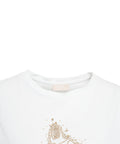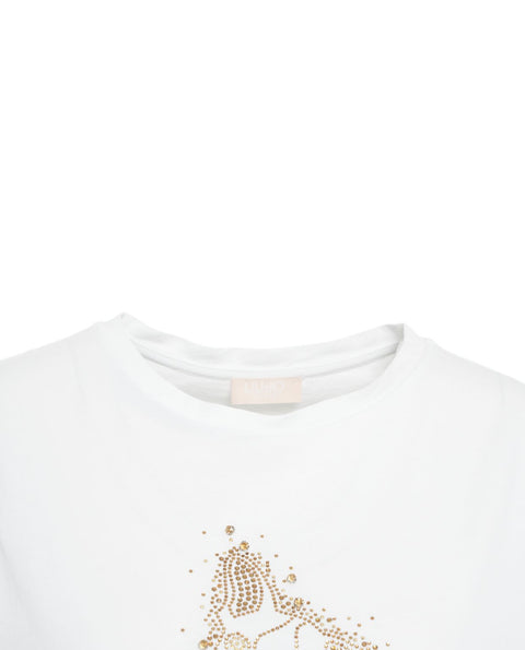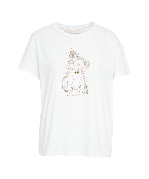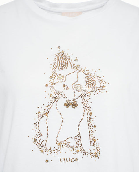 Dieses T-Shirt von Liu Jo White präsentiert sich mit einem charmanten Hundemotiv aus funkelnden Strass-Applikationen. Es verfügt über einen klassischen Rundhalsausschnitt und kurze Ärmel. Gefertigt aus einem angenehmen Material, bietet es eine bequeme Passform für den Alltag.