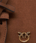 Diese elegante Handtasche aus hochwertigem Wildleder ist ein luxuriöses Accessoire für jede Garderobe. Sie verfügt über zwei stabile Henkel und einen praktischen Reißverschluss für das Hauptfach. Goldfarbene Metalldetails und das ikonische Love-Birds-Logo von Pinko unterstreichen das exklusive Design. Ein abnehmbarer Anhänger mit Logo ergänzt den stilvollen Look.