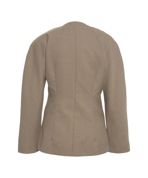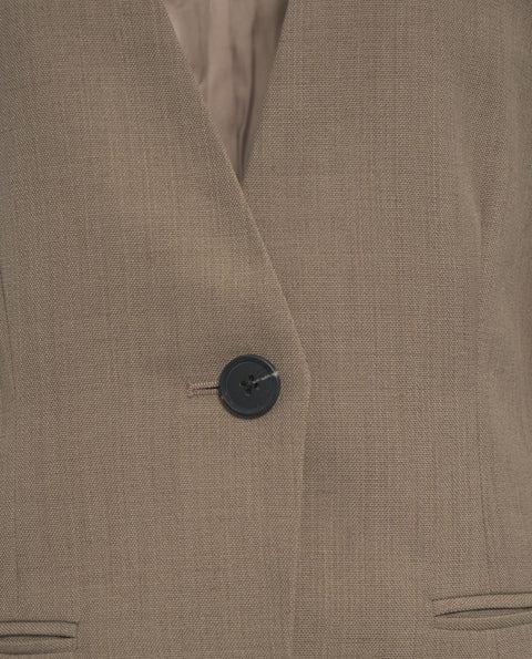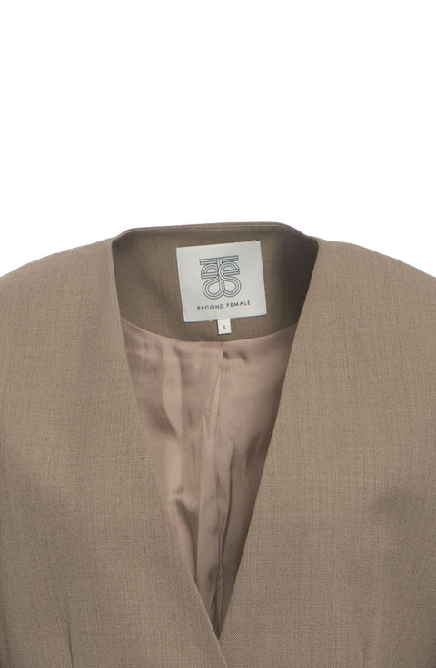 Der Second Female Blazer 'Levelup' besticht durch seine moderne, kragenlose Silhouette mit V-Ausschnitt. Dieser einreihige Blazer verfügt über einen einzigen Knopfverschluss und zwei Leistentaschen, die das minimalistische Design unterstreichen. Die leicht ausgestellten Ärmel und die strukturierte Webart verleihen ihm eine elegante, zeitgemäße Note und machen ihn zu einem vielseitigen Kleidungsstück.