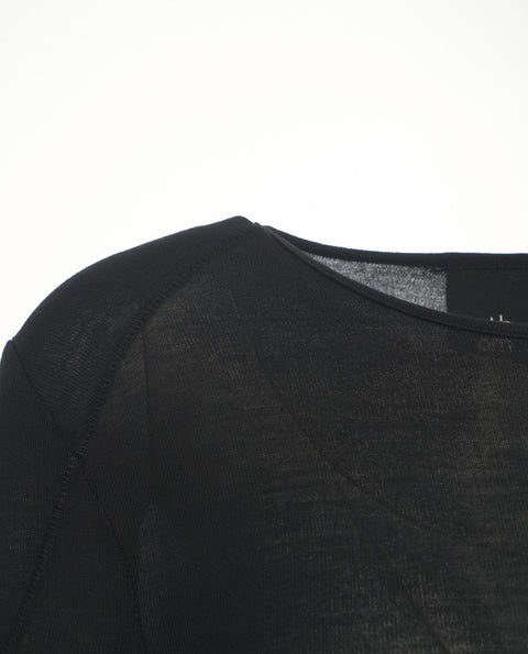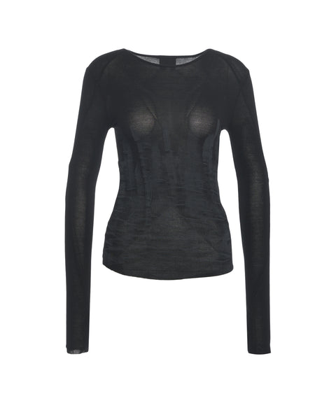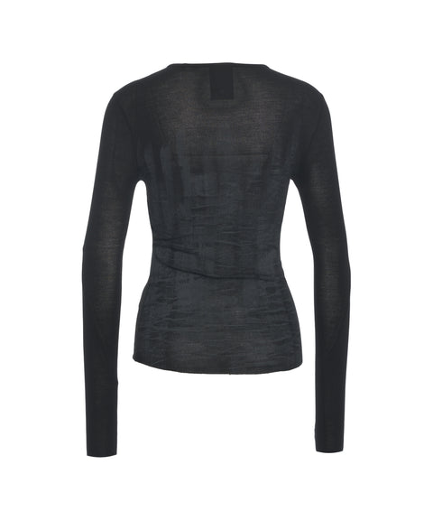Dieses exklusive Longsleeve von Thom Krom ist aus feinem Strick gefertigt und besticht durch seine semi-transparente Qualität. Das eng anliegende Design mit Rundhalsausschnitt und langen Ärmeln betont die Silhouette. Eine subtile, gewellte Textur im Torsobereich verleiht dem Oberteil eine einzigartige Note. Ideal für vielseitige Lagenlooks.