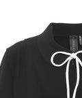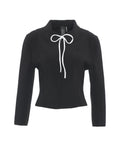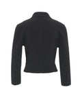 This elegant jacket by Norma Kamali features a fitted, cropped cut. It has a rounded collar adorned with a distinctive bow detail. The versatile design makes it an ideal pairing for sophisticated occasions or stylish everyday looks. It combines quality with a contemporary aesthetic.