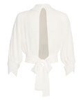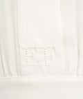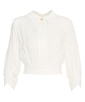 This elegant blouse by Elisabetta Franchi impresses with its sophisticated design. It features a classic collar and a stylish button closure, accented by a subtle logo detail. The wide, long sleeves are artfully gathered and end in distinctive cuffs. An elasticated waistband at the waist ensures a flattering silhouette and high wearing comfort, ideal for versatile looks.