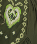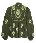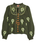 This Farmrio blouse is a feminine highlight for any occasion. It features an elegant stand-up collar and elaborate embroidery that extends over the décolletage and sleeves. The button closure is complemented by charming tassel tie-fastenings, while long sleeves with elasticated cuffs ensure a comfortable fit. An ideal piece to add a luxurious and detailed touch to any outfit.