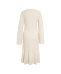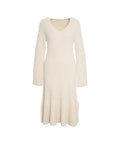 This elegant knit dress 'Lise' by Second Female comes in a comfortable midi length. It features a flattering V-neck and long ribbed knit sleeves. The flared skirt section with ruffle details at the hem gives the design a feminine touch. A versatile piece for stylish appearances.
